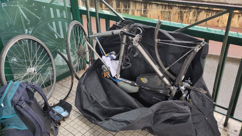 Reassembling the bike at the bus station in Saint Jean de Luz.